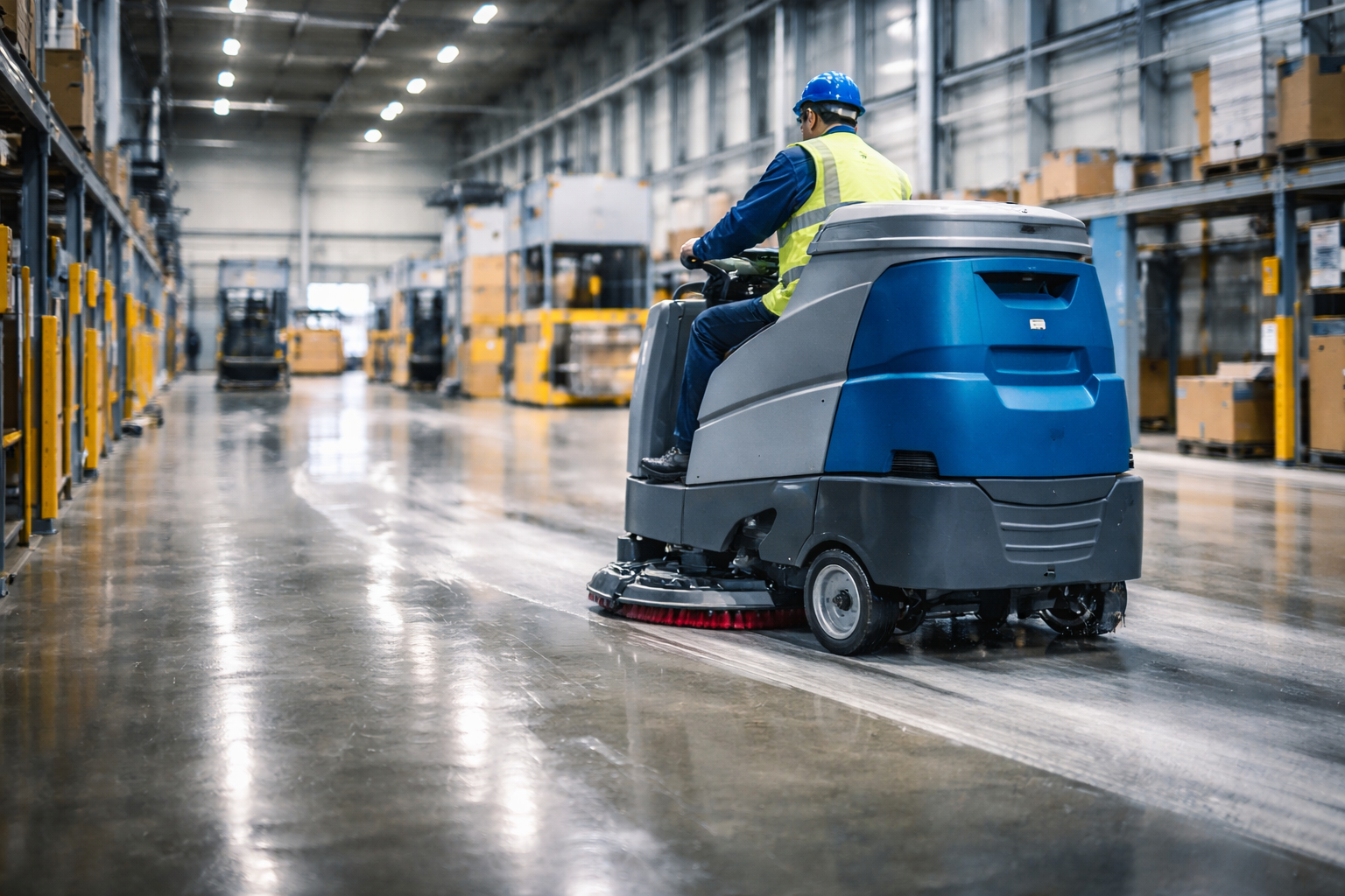 Professional floor scrubbing and sweeping for warehouses, commercial buildings, and industrial spaces.